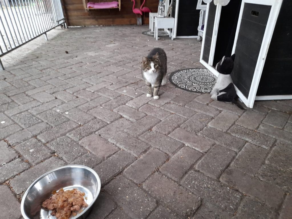 Frankie is ook weer zo’n bijzondere bewoner. Weggevangen als verwilderde kat. Zijn redders nog behoorlijk toegetakeld en hier ook gedurende een lange periode niet benaderbaar. En toen besloot Frankie opeens, echt als een donderslag bij heldere hemel, om er de voorkeur aan te geven om altijd wel ergens in onze nabijheid te verblijven. Knappe Frankie! En zo is het leven ook voor hem toch nog veel leuker geworden. Niet echt aaibaar maar zijn grootste angsten heeft hij achter zich weten te laten en daar doen we het allemaal voor. Een goed en veilig thuis in relatieve vrijheid!