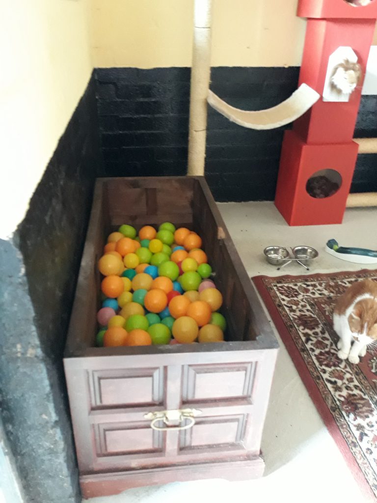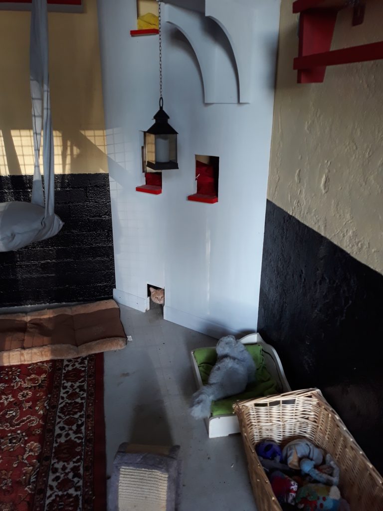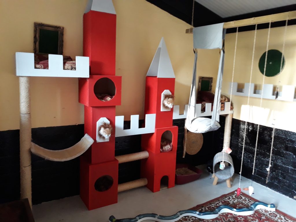 Met in totaal 22 units is het een behoorlijk opgave, ook financieel. De kosten worden geschat op pakweg 250 euro per dierenunit. Het is de bedoeling dat het thema-units worden. Eén van onze kattenkamers werd al omgetoverd tot Jungle-room, we hebben inmiddels ook Buckingham Palace. Die zijn erg mooi geworden, maar we hebben er nog een aantal te gaan.