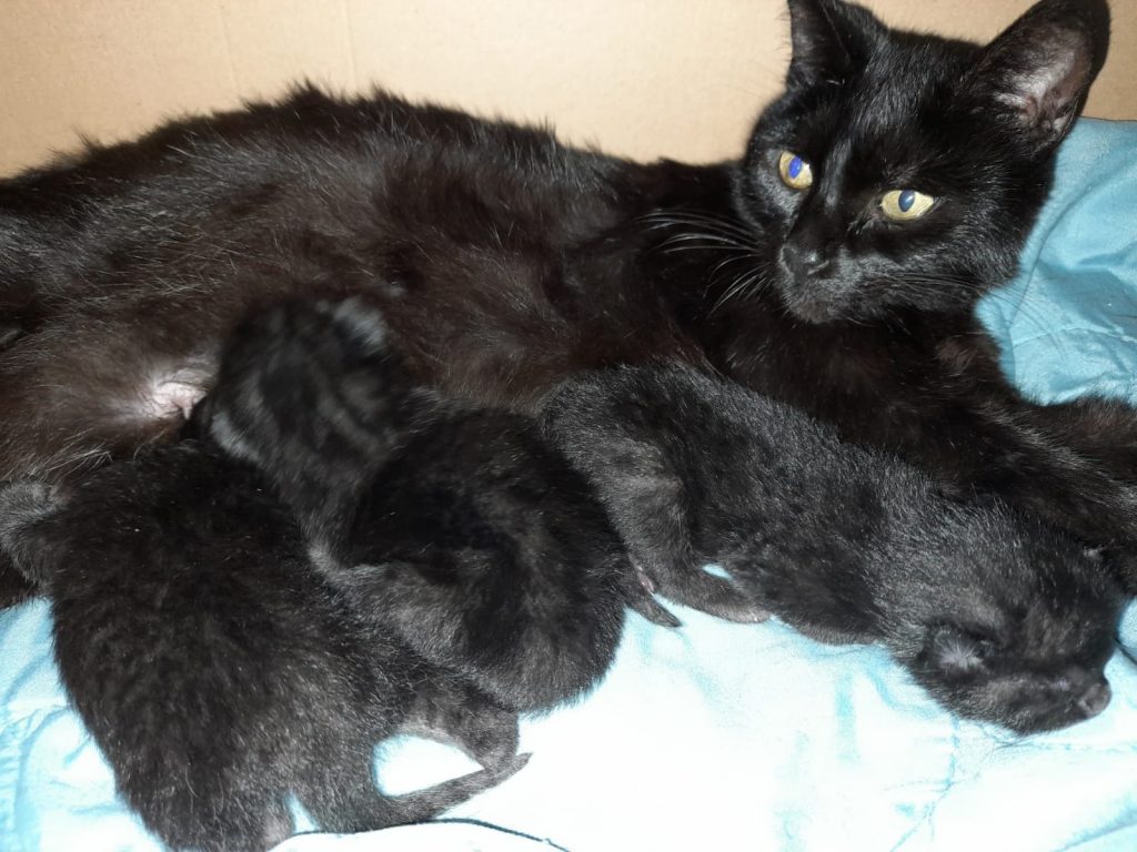Mimi was ooit een wel heel erg onverwachte gast in het Kattenwoud. Ze stonden er letterlijk en figuurlijk opeens mee op de stoep. En nu is het niet gebruikelijk dat we die doelloos in het rond zwervende dieren zo maar op (kunnen) nemen maar Mimi was zelf nog een jong poesje en hoogzwanger van (zo bleek achteraf) 3 kittentjes. Zwart, jong, drachtig en nergens welkom… Bovendien wilden we voorkomen dat ze na het werpen en zogen nog langer ongeneutraliseerd door het leven zou gaan en hebben we haar maar liefdevol opgenomen. Wat een dankbare schat is het zeg! Zó ontzettend lief. Ondanks haar eigen jeugdige leeftijd was ze een super goede moeder voor haar kittens en zodra die geheel op eigen pootjes staan mogen die op zoek naar een eigen voor altijd thuis-huis en wordt Mimi gesteriliseerd.